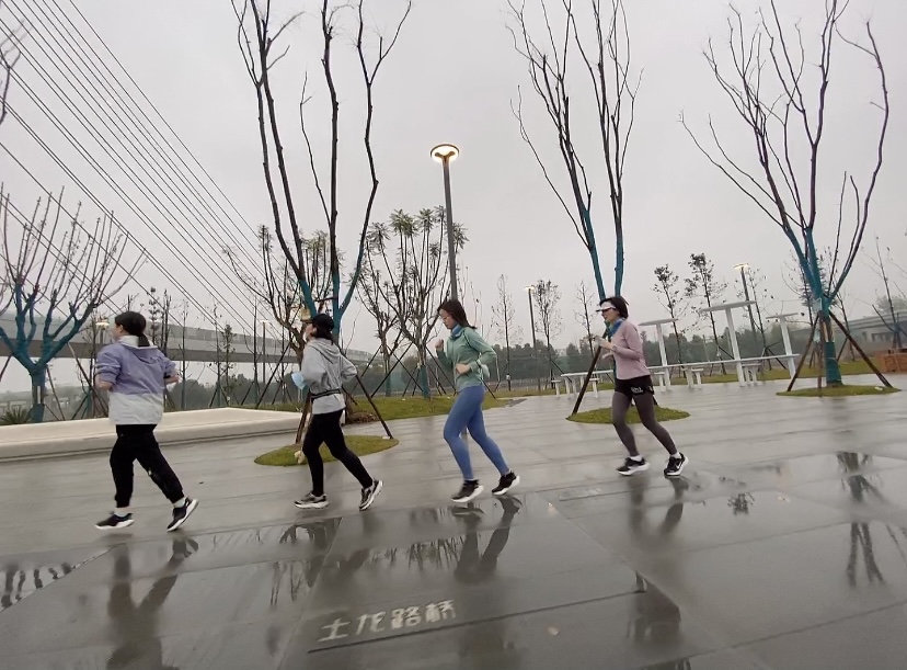 清晨的成都下起了一场淅淅沥沥的小雨,氤氲着雾气的锦城湖显得格外秀丽。天公作美,队员们陆续抵达后雨停了,大家来到绿道上集结,一阵寒暄后,做完热身运动开始环湖慢跑。