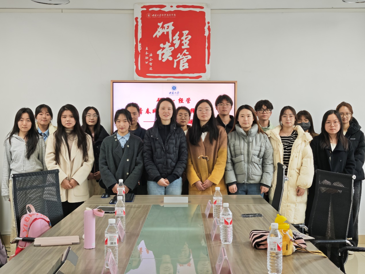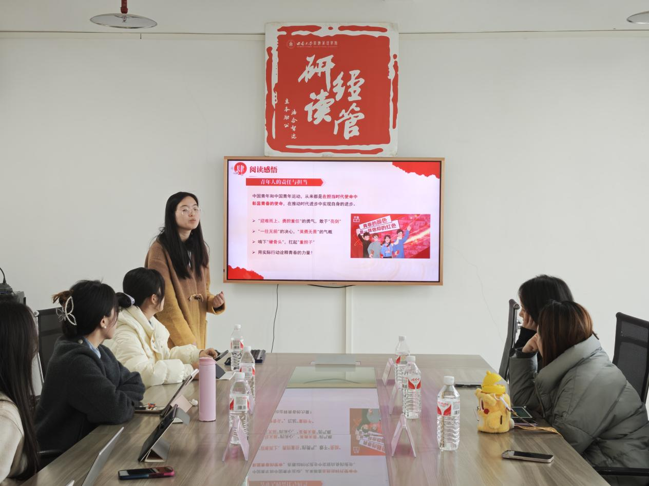 2025年3月14日下午,bevictor1946韦德官网“研读·经管”读书会第二十七期在bevictor1946韦德官网A406教室顺利举行。本次读书会以“青春践使命 奋斗释担当”为主题。由公司2023级农业管理专业硕士研究生苏紫涵、区域经济学专业硕士研究生吴双虹和2024级企业管理专业硕士研究生曾璐瑶、农村发展专业硕士研究生陆逸担任主讲人,研究生辅导员任娟出席活动并作总结。本次读书会由2024级金融专业硕士研究生刘楠主持。