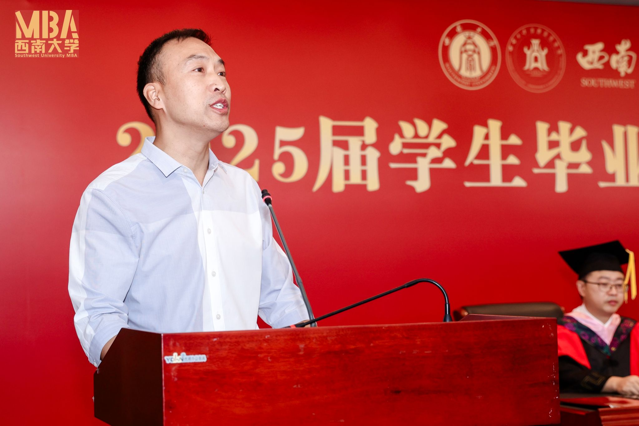 教师代表、公司非全专硕教育中心副主任王双龙老师对同学们顺利完成学业表示祝贺,他高度赞扬同学们在平衡工作、家庭与学业过程中展现的奋斗精神,称赞每位毕业生都是"人生的勇士"。他勉励大家要把握商业本质,在复杂环境中做出明智决策,发挥领导力影响他人。