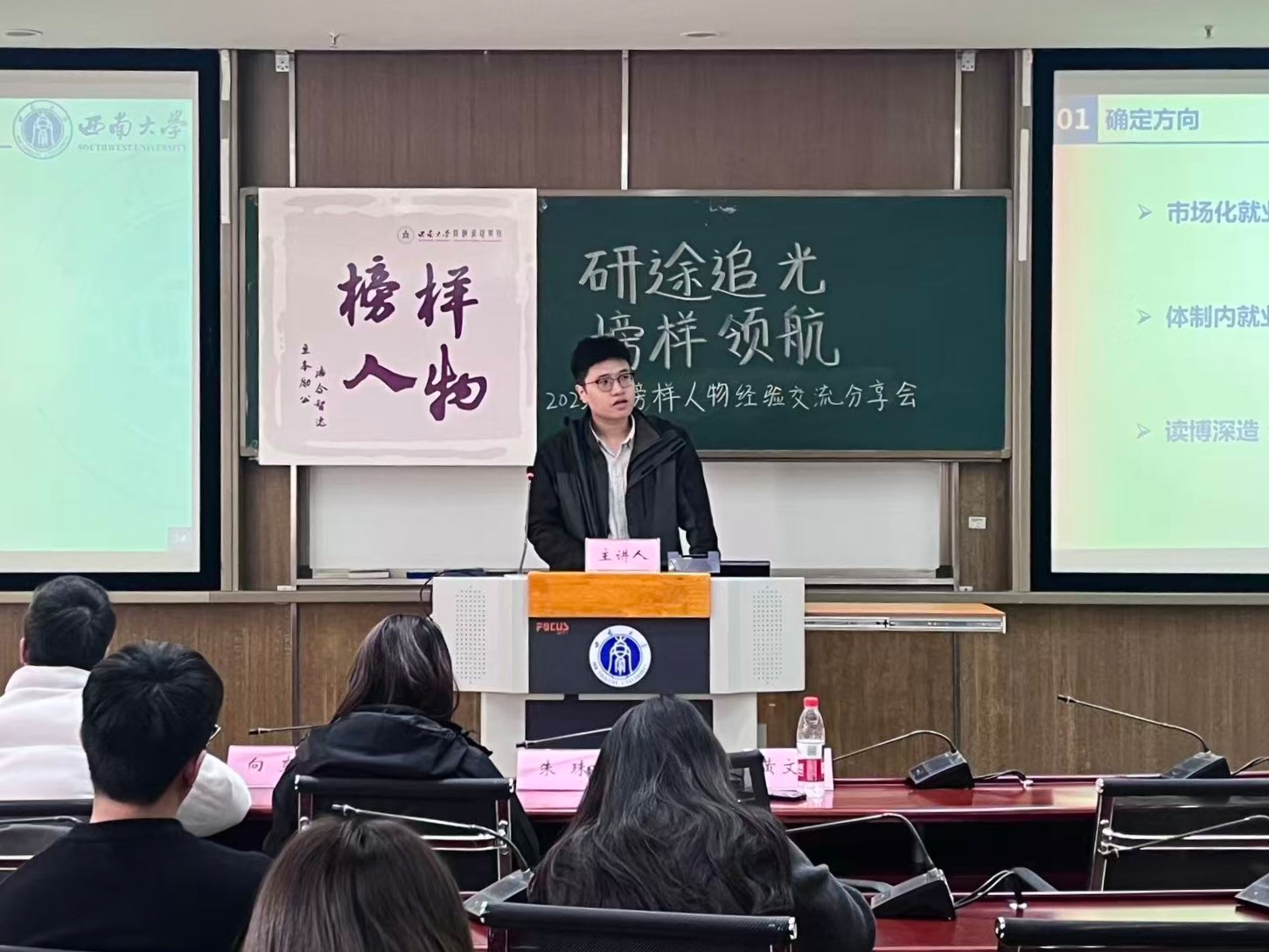 榜样是划破迷茫的星火,是照亮征途的路标,更是青年一代逐梦路上最鲜活的参照。为深入学习贯彻习近平新时代中国特色社会主义思想,全面落实立德树人根本任务,充分发挥优秀学子的示范引领作用,11月28日下午,研究生榜样人物经验交流分享会在公司B203教室顺利举办。本次活动以“研途追光 榜样领航”为主题,邀请三位国家奖学金获得者进行分享,分别为2024级农业经济管理专业博士研究生朱珠同学、2023级企业管理专业硕士研究生向爽同学、2023级农业管理专业硕士研究生黄文鹏同学。