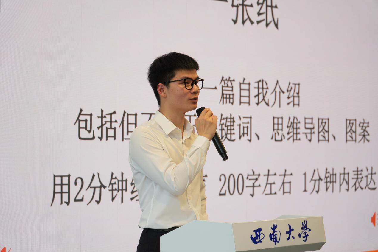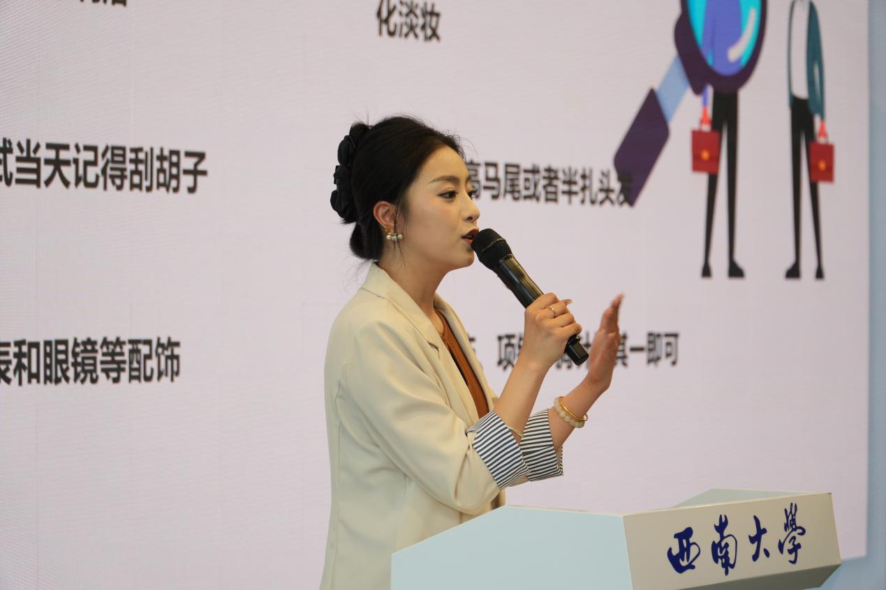 重庆市高校优秀毕业生、新闻传媒公司研究生王沛瑶分享了如何“眼前一亮”把握一面之缘,展示了她在服装搭配、妆容妆造、动作形体方面的经验,鼓励同学们做“最美应试者”。