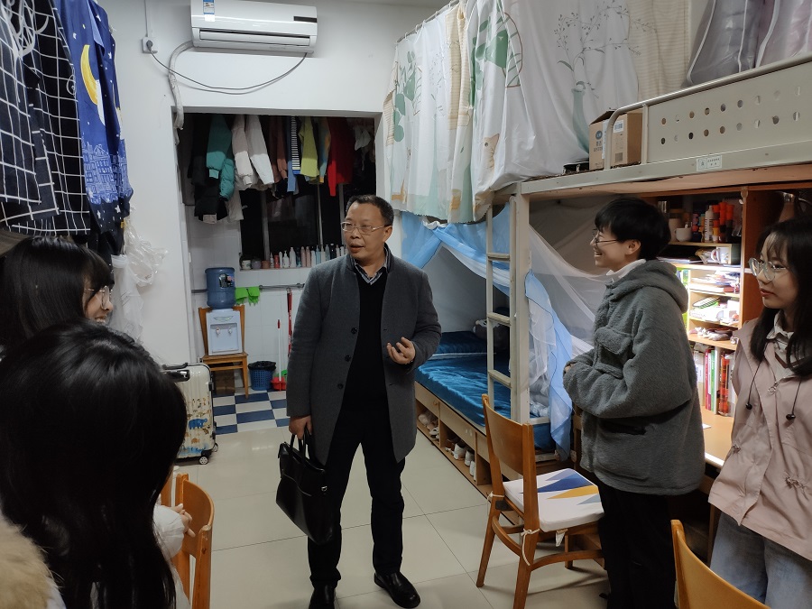 公司党委书记、经理祝志勇教授来到2019级本科生寝室,关心询问同学们大学第一学期的学习感受,了解同学们的寒假计划。看到衣着单薄的同学,祝老师亲切地叮嘱注意保暖;语重心长的勉励家境贫寒的同学努力奋进,有困难第一时间找公司。听祝老师聊家常,聊课程学习方法,聊老员工活适应和转变,同学们收获良多,纷纷邀请祝老师常来寝室坐坐。