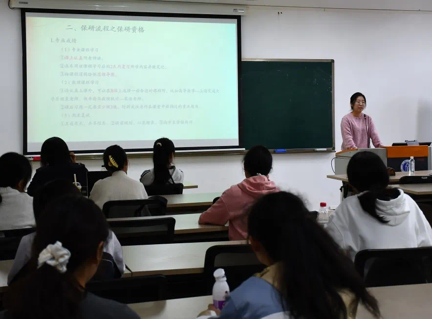 已成功推免至重庆大学的冯夕桐同学和成功推免至东南大学的胡佳婷同学围绕学业规划、科研竞赛、院校选择与面试考核等关键环节展开分享,详细讲解了保研流程、夏令营申报策略,梳理了笔试与面试中的常见问题,并鼓励同学们勇于尝试,为处于不同阶段的同学提供了有针对性的指导。来自新东方教育科技集团的赵文龙老师从专业的宏观视角深入剖析了升学深造时间轴,帮助同学们更好地进行升学规划。