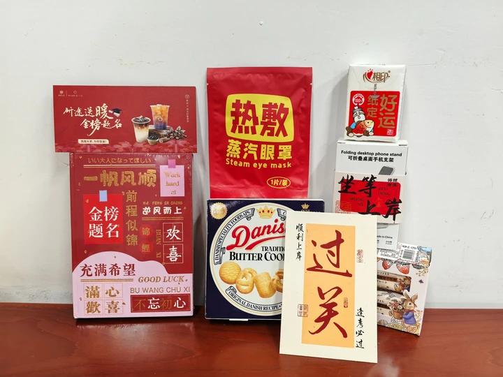 公司为考研学子精心准备了“易如反掌”考研大礼包,礼包内的每一份礼品都寄托着美好的寓意:“纸定高分”纸巾承载着下笔有神、高分稳拿的期许;“坐等上岸”支架助力同学们高效复习、轻松备考;“属你最牛”牛轧糖为备考时光增添甜蜜滋味;“取得头筹”曲奇祝愿大家考场夺魁、金榜题名;“一帆风顺”笔记本则陪伴同学们记录最后冲刺的点滴。一份份满载心意的礼包,一句句温暖有力的叮嘱,让同学们深切感受到公司的浓浓关怀。
