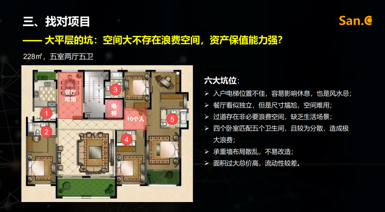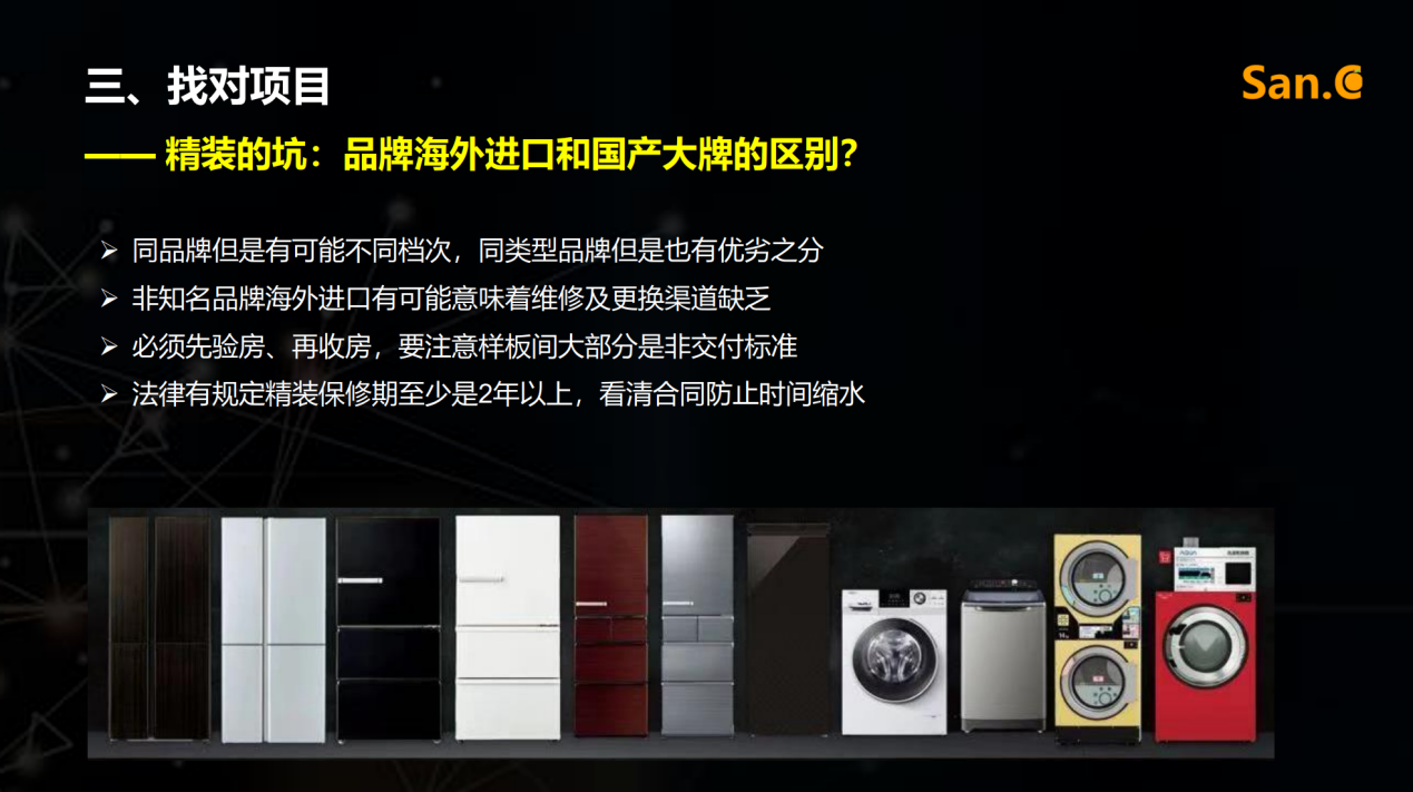 再者,找对项目。此过程存在大平层、精装和房企三大坑。