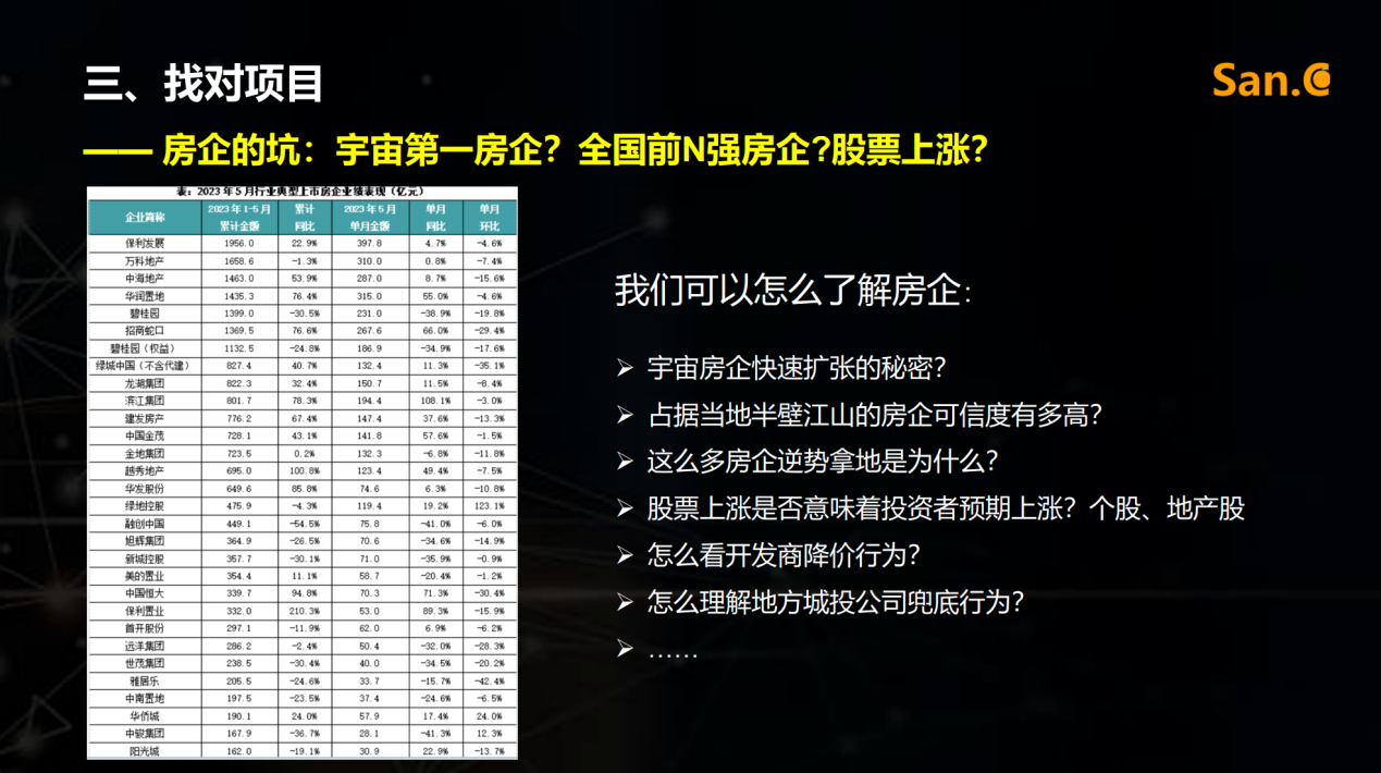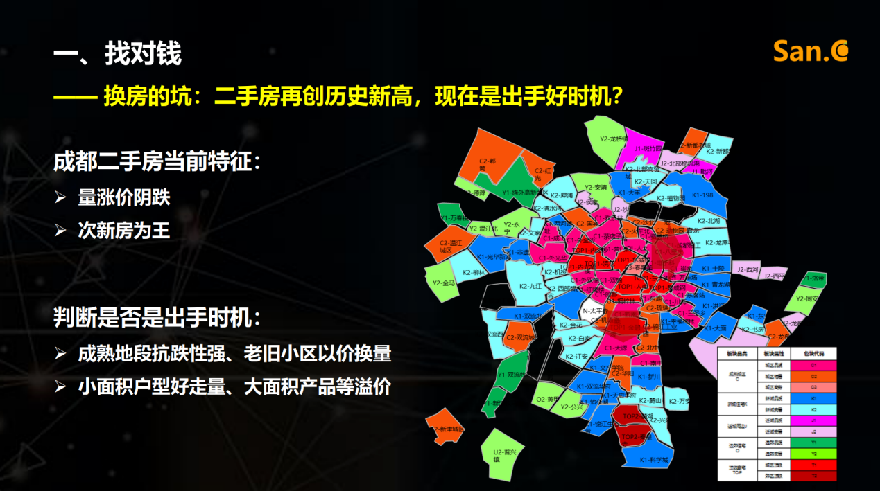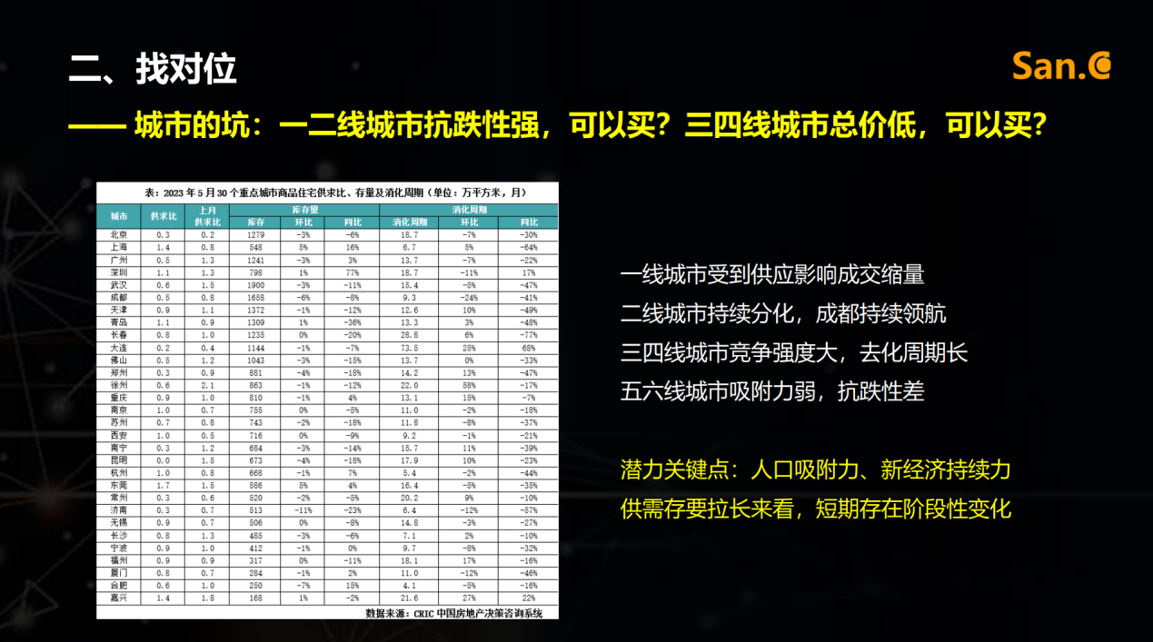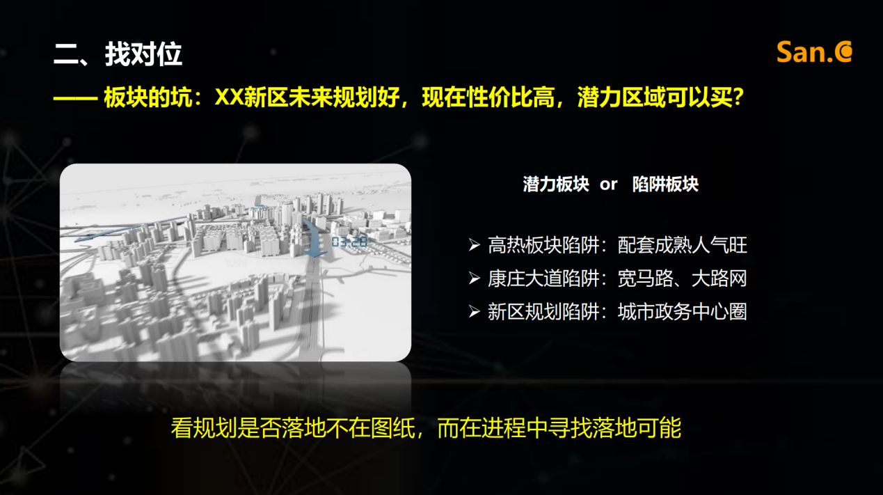 其次,找对位。丰雁老师按照“城市的坑”和“板块的坑”两部分来做的讲解。城市的坑重点关注城市商品住宅供求比、存量及消化周期几项指标。另外,还需要注意几个潜力关键点:拉长看供需存,注意人口吸附力、新经济持续力、短期存在的阶段性变化。板块的坑则需要了解高热板块、康庄大道、新区规划这三种常见的陷阱。