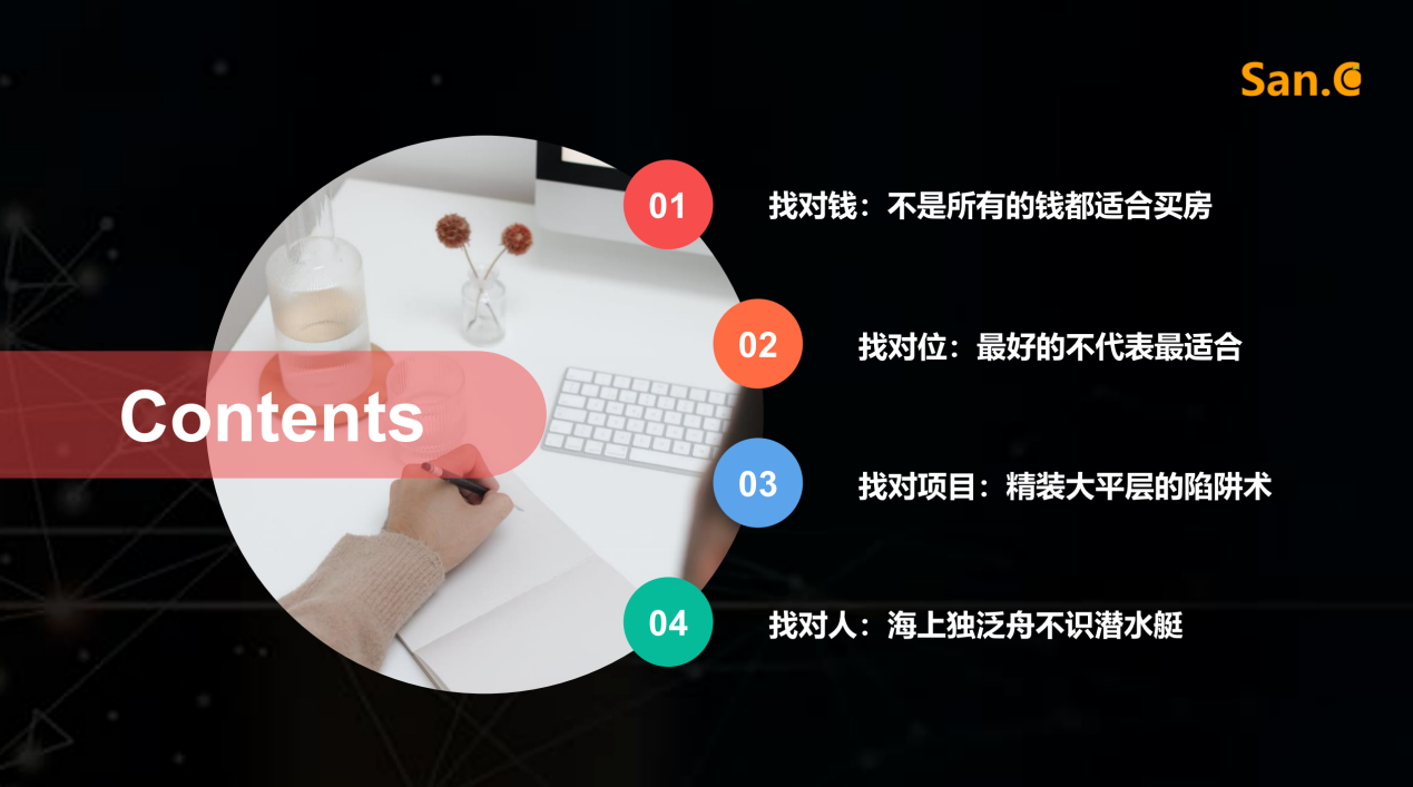 最后,找对人。这部分丰雁老师提出了在购房渠道上,对接人的专业度参差不齐且大多数人都是利益驱使者,不会将购房者的利益放在第一位。因此,建议购房者尽可能自己多跑动、多进行市场调研或者寻找专业的人或机构合作。