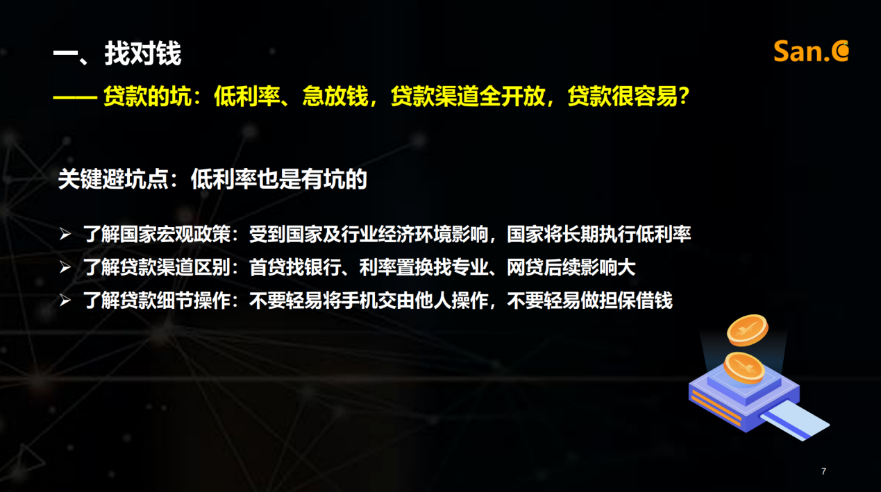 首先,找对钱。购房资金的筹备主要涉及两种坑。一是自有资金。除了现有资金以外,还有可能产生置换资金,自然面临一个核心问题——如何避开换房的坑。丰雁老师强调需要从四个关键点来判断当前是否是出手的时机。二是筹措资金。主要分为亲友借款和三方贷款两种方式。如果走贷款渠道,应该通过了解国家宏观政策、贷款渠道区别、贷款细节操作等来避开贷款的坑。