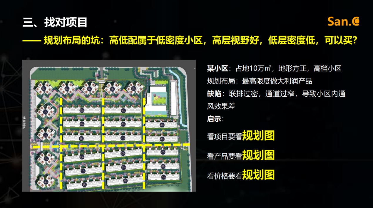 在讲到本次分享最核心的部分时,丰雁老师不厌其烦地强调:看项目要看规划图、看产品要看规划图、看价格要看规划图!除此以外,地形是否异形、与周围资源关系、产品组合布局、户型所在位置这四个要素也不容忽视!