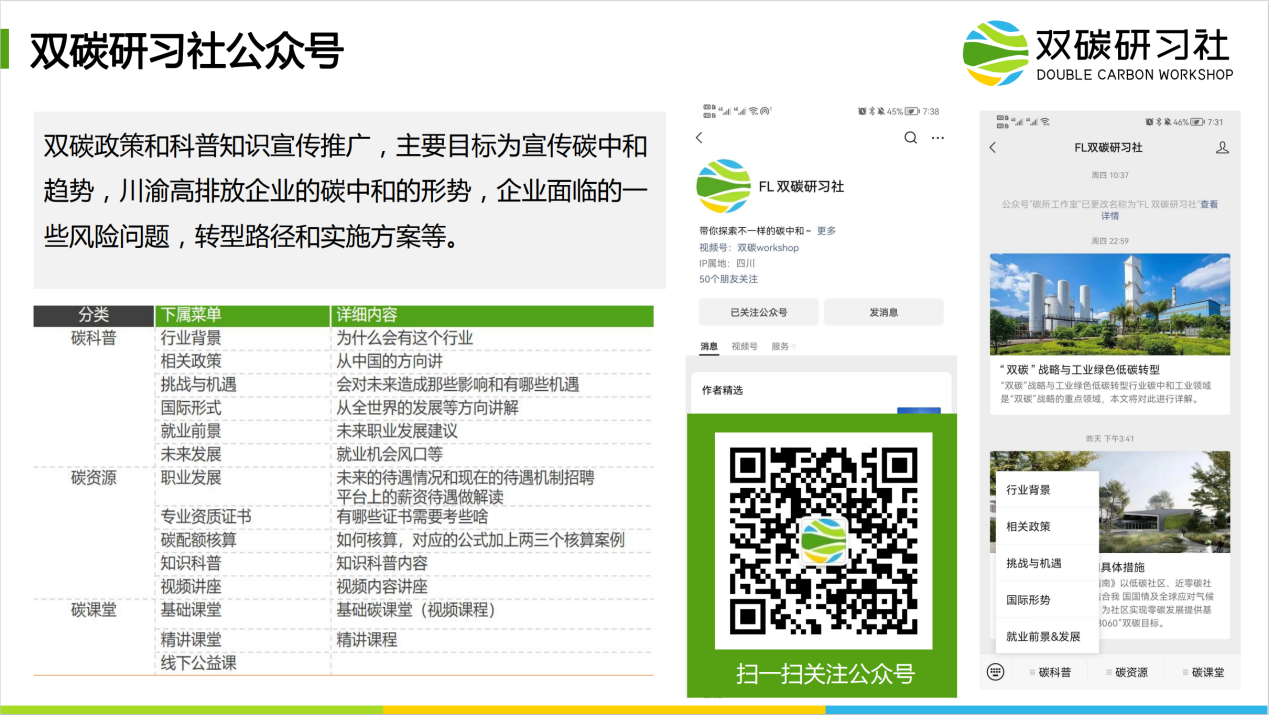 首先,姜老师简要介绍了双碳研习社。该项目作为双碳政策和科普知识宣传推广平台,主要目标为宣传碳中和政策趋势,构建碳市场、碳资产管理、CCER开发、林业碳汇开发、第三方碳核查、碳排放权、碳配额、碳认证等双碳产业链知识体系,帮助企业和个人开展能力建设,促中国碳市场发展,更好地支撑国家“30·60”目标。