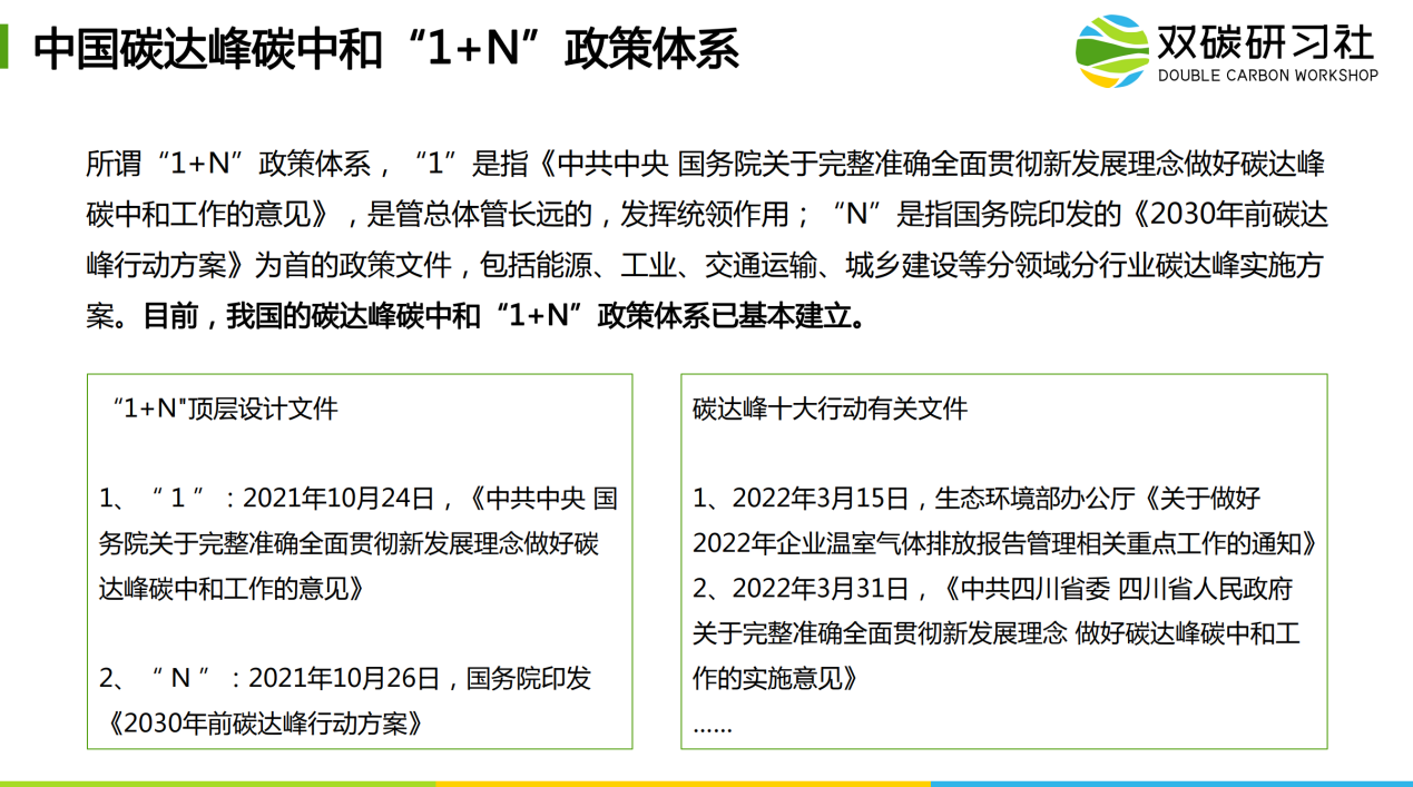 为承担解决气候变化问题中的大国责任、推动我国生态文明建设与高质量发展,2020年9月,习近平主席在第75届联合国大会上宣布,中国力争2030年前二氧化碳排放达到峰值,努力争取2060年前实现碳中和目标。2021年10月,《关于完整准确全面贯彻新发展理念做好碳达峰碳中和工作的意见》以及《2030年前碳达峰行动方案》,这两个重要文件的相继出台,共同构建了中国碳达峰、碳中和“1+N”政策体系的顶层设计。