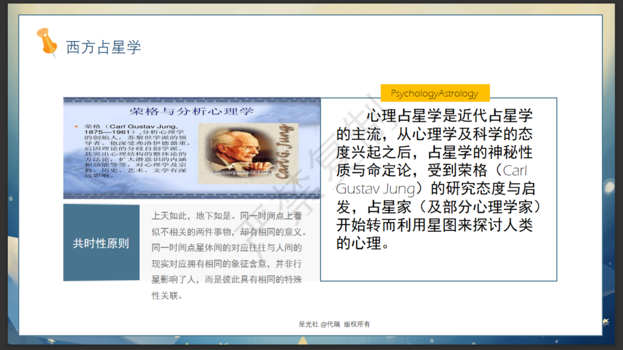 随后,代老师分享了近代占星学主流——心里占星学的由来,并通过星图普及了十二宫、常用10颗行星等知识点,带领大家进一步了解十二星座对应的四元素及特点,引出占星学在个人层面的应用,进而升华到宏观层面的应用。