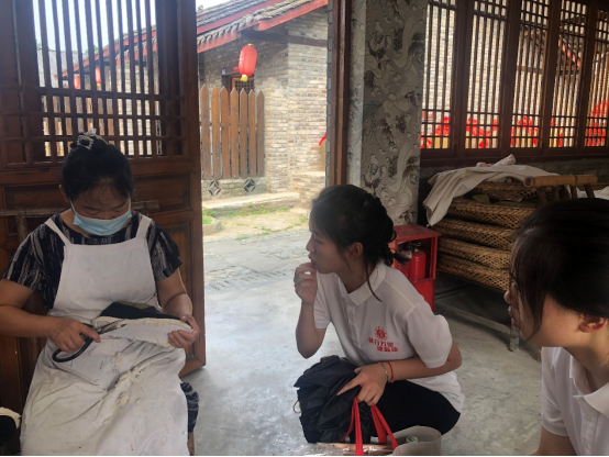 9日下午,队员们来到战旗村村史馆和“乡村十八坊”。在村史馆,队员们了解了战旗村基层工作人员带领村民走向共同富裕的历程。战旗村由最初的“只有三间猪棚,一个木制文件柜,三把圈椅和700元债务”蜕变成全国乡村振兴示范村,显示了战旗村“走在前列,起好示范”的乡村振兴历程。在“乡村十八坊”内,队员们与当地村民深入交流,了解到“乡村十八坊”是战旗村自主开发经营并以传承非物质文化技艺为核心的文旅综合体项目,内设有豆瓣坊、布鞋坊等十八个传统工艺作坊,集产品制作展示、参观学习、体验销售为一体。在这里,队员们切实感受到战旗村在促进乡村振兴方面所作出的尝试,以及乡村振兴战略给居民生产生活方式带来的巨大变化。