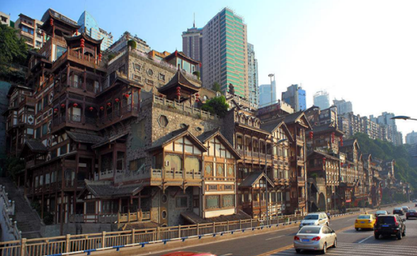 洪崖洞,原名洪崖门,是古重庆城门之一,位于重庆市渝中区解放碑沧白路,地处长江、嘉陵江两江交汇的滨江地带,以其巴渝传统建筑和民俗风貌特色而出名。2006年,由重庆市人民政府总投资3.85亿元兴建而成。主要由吊脚楼、仿古商业街等组成。建筑面积4.6万平方米。