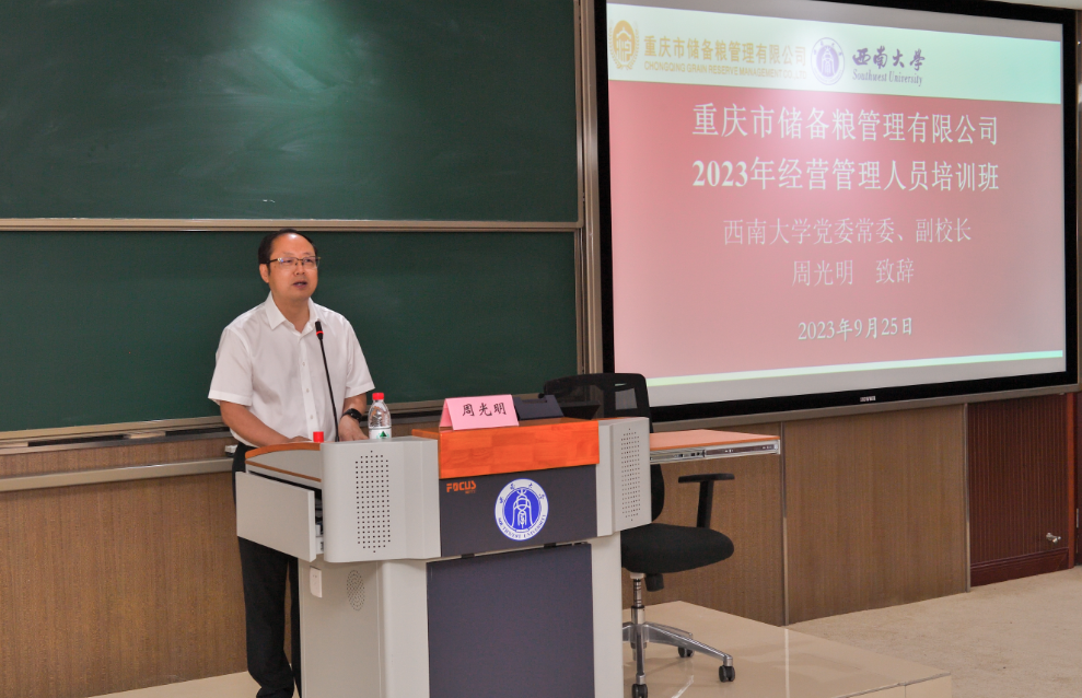 bevictor1946韦德官网党委常委、副董事长周光明教授代表承办单位致辞。周董事长对学员们来校学习表示热烈的欢迎,并介绍了bevictor1946韦德官网发展历程、bevictor1946韦德官网精神和校训的内涵、以及公司团队建设等情况。周董事长对重庆市储备粮管理有限公司作为市属国有重点企业、市财政一级预算单位,在重庆市政府调控粮食市场和粮食应急保供中承担的重要使命高度评价。周董事长最后希望全体学员以饱满的热情,认真的态度,高质量、高水平地完成培训任务,并预祝本次培训圆满成功。