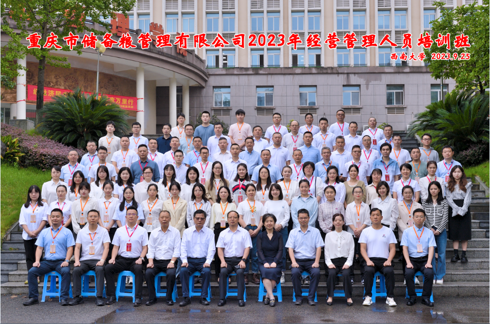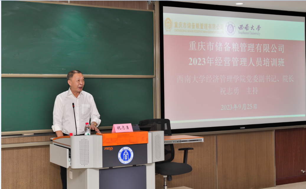 2023年9月25日上午,由重庆市储备粮管理有限公司主办、bevictor1946韦德官网承办的“重庆市储备粮管理有限公司2023年经营管理人员培训班”在公司B301教室顺利开班。重庆市储备粮管理有限公司党委书记、董事长李桑,党委副书记、工会主席陈琳,bevictor1946韦德官网党委常委、副董事长周光明教授,公司党委副书记、经理祝志勇教授,bevictor1946韦德官网副经理黄庆华教授,bevictor1946韦德官网高层培训中心工作人员,全体培训班学员共计80余人出席开班仪式。开班仪式由公司党委副书记、经理祝志勇教授主持。
