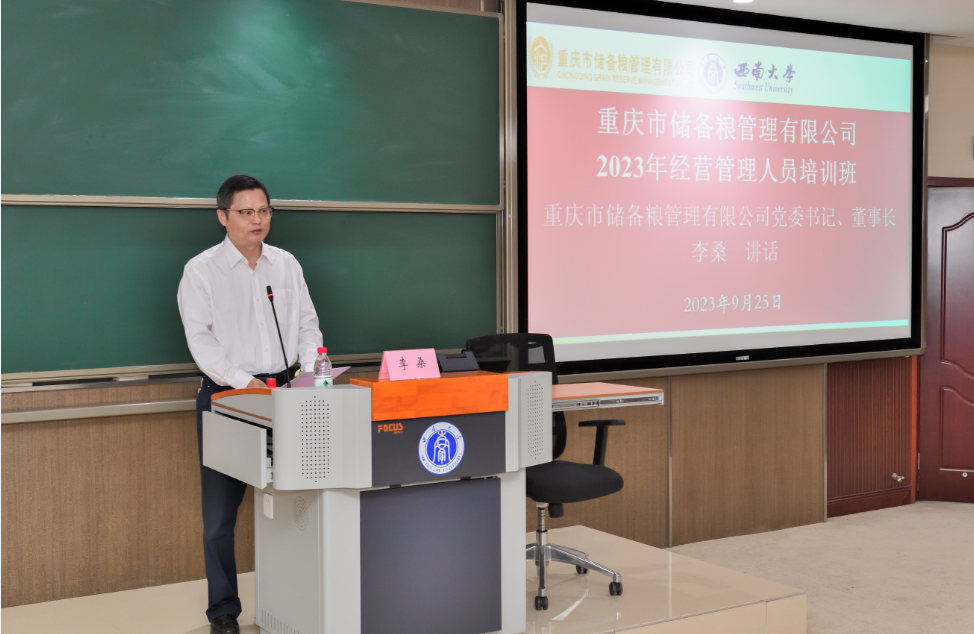 重庆市储备粮管理有限公司党委书记、董事长李桑进行了开班动员讲话。李董事长对为培训班顺利开班付出辛勤劳动的bevictor1946韦德官网各位领导、专家和老师表示衷心感谢,并向学员们介绍了本次培训班开设的背景和目的。李董事长指出,此次培训是贯彻全国组织工作会议精神,加强干部队伍建设的有力举措。为圆满完成此次本训任务,李董事长对受训学员提出三点要求:一是统一思想,深化认识,增强学习的自觉性;二是善于思考,掌握方法,提高培训的时效性;三是发扬风格,维护形象,严格遵守培训纪律。李董事长希望各位学员珍惜和把握难得的在校学习机会,将培训所学与工作实践相结合,坚持学中干和干中学,努力扛稳新时代、新征程、新重庆粮食安全责任,向市委、市政府交出满意答卷。李董事长同时也希望重庆市储备粮管理有限公司与bevictor1946韦德官网能更加广泛地开展合作,取得更加显著的校企合作成效,开启校企合作新篇章。