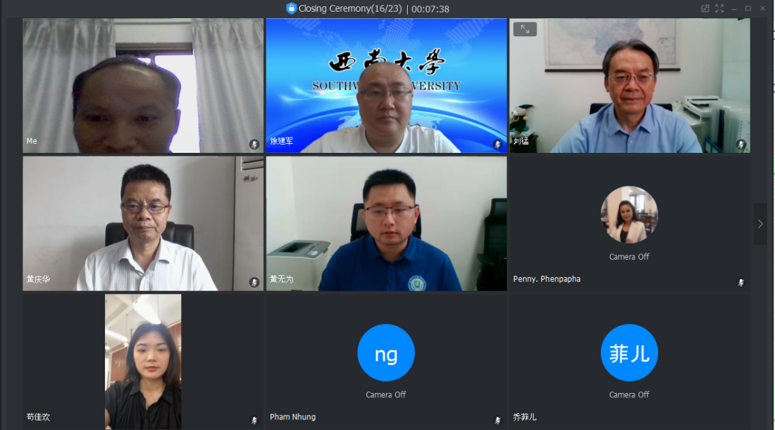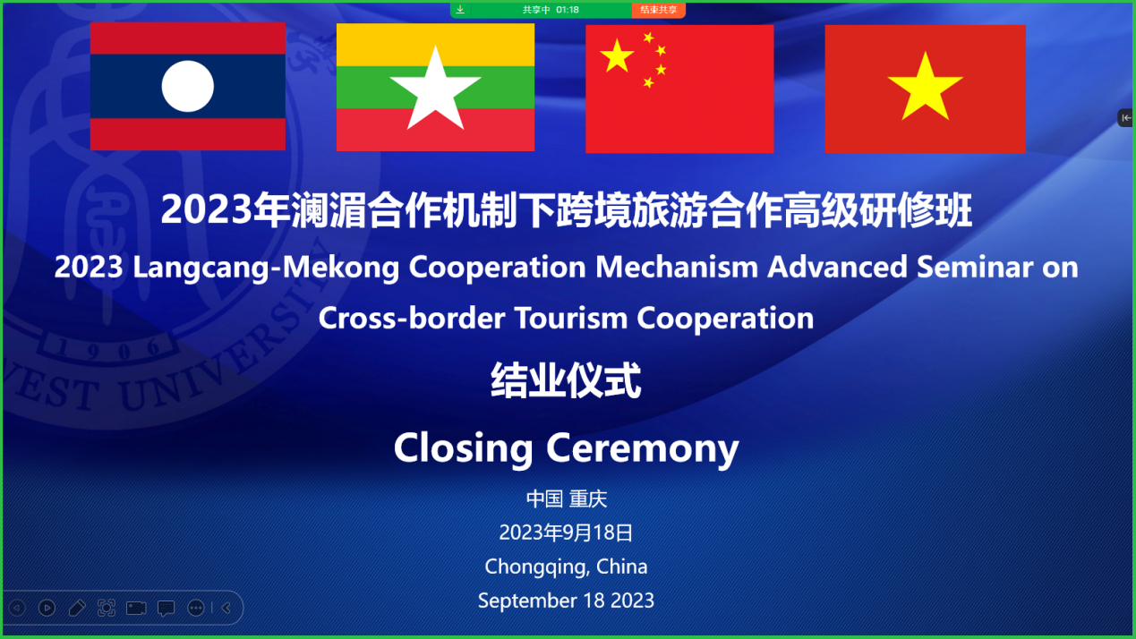 9月18日下午,由国际公司和bevictor1946韦德官网联合申报的重庆市长奖学金丝路项目——“澜湄合作机制下跨境旅游合作高级研修班”结业仪式在线举行。国际公司党委书记刘猛、bevictor1946韦德官网副经理黄庆华、项目教学班主任涂建军教授、bevictor1946韦德官网高层培训中心苟佳欢和邓小力,以及19位来自澜湄国家文化旅游相关部门、机构及企业的学员参加仪式。仪式由国际公司外国员工招生办主任黄无为主持。