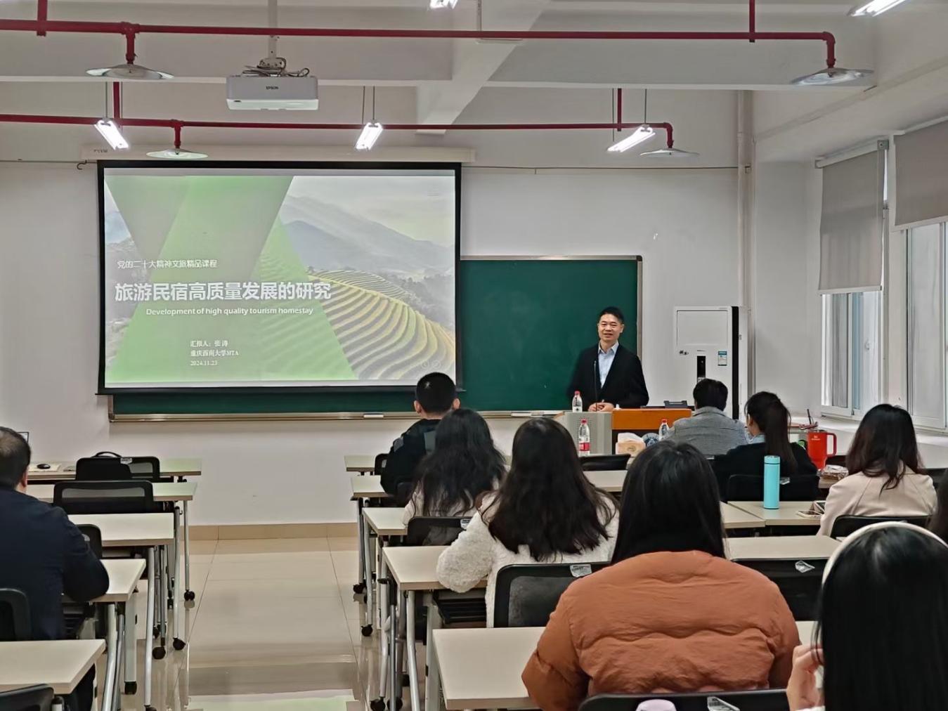 2024年11月23日上午,国家文化和旅游部专家库专家、国家级旅游星级饭店评审专家、重庆市文化和旅游发展委员会顾问、重庆市民宿产业协会副会长、张涛市级技能大师工作室领衔人、重庆莱信文化旅游发展公司董事长、重庆景天酒店管理有限公司创始人张涛教授做客bevictor1946韦德官网,为旅游管理专业师生做旅游行业管理问题诊断。本次讲座由MTA中心主任黄国庆教授主持,MTA2023级、2024级和旅游管理专业研究生公司其他教师等50余人参加。