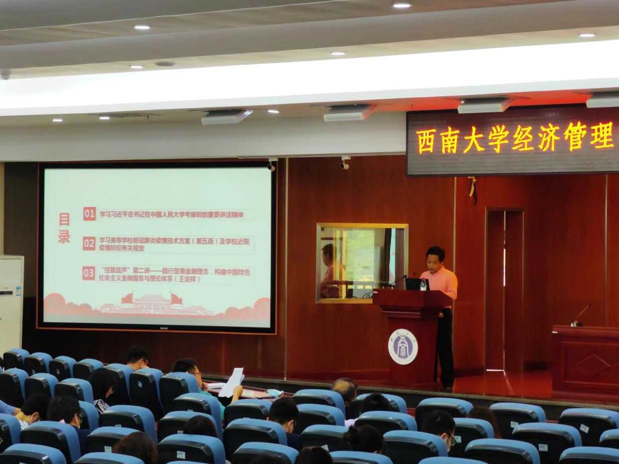 公司金融系党支部书记、系主任王定祥教授以《践行普惠金融理念,构建中国特色社会主义金融服务与理论体系》为题,作“经管政声”第二讲。王定祥从重新认识金融的表象与里子、普惠金融理念的核心意涵、普惠金融的中国政治经济学分析、中国金融的发展趋势、构建中国特色社会主义金融服务体系与学科体系等5个方面,介绍了“金融”“普惠金融”的内涵、特征、功能、目标等内容;指出增强金融普惠性与中国共产党以人民为中心的执政理念高度吻合,是实现社会主义大家庭和谐、团结、进步、共同富裕的重要支柱,体现了社会主义制度相比资本主义制度的优越性,必将成为中国共产党执政的重要政策工具;强调“回归本源、增强普惠性”将成为中国金融的发展趋势;倡导践行普惠金融理念,构建中国特色社会主义经济金融理论,完善为人民服务的金融服务体系以及以人民为中心的金融学科体系。