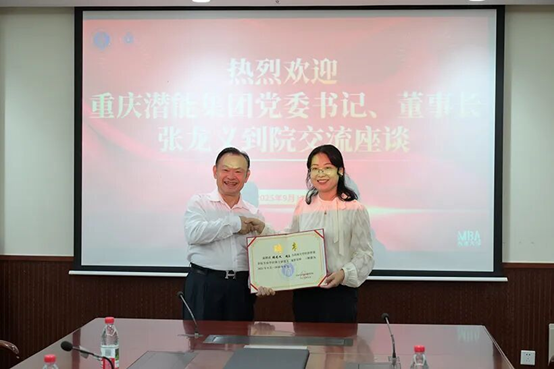 张龙义董事长系公司承办的重庆市工商联主席会长培训班学员,公司专业学位硕士研究生兼职导师。讲座开始前,公司经理杨丹教授为张龙义董事长颁发了兼职导师续聘聘书。