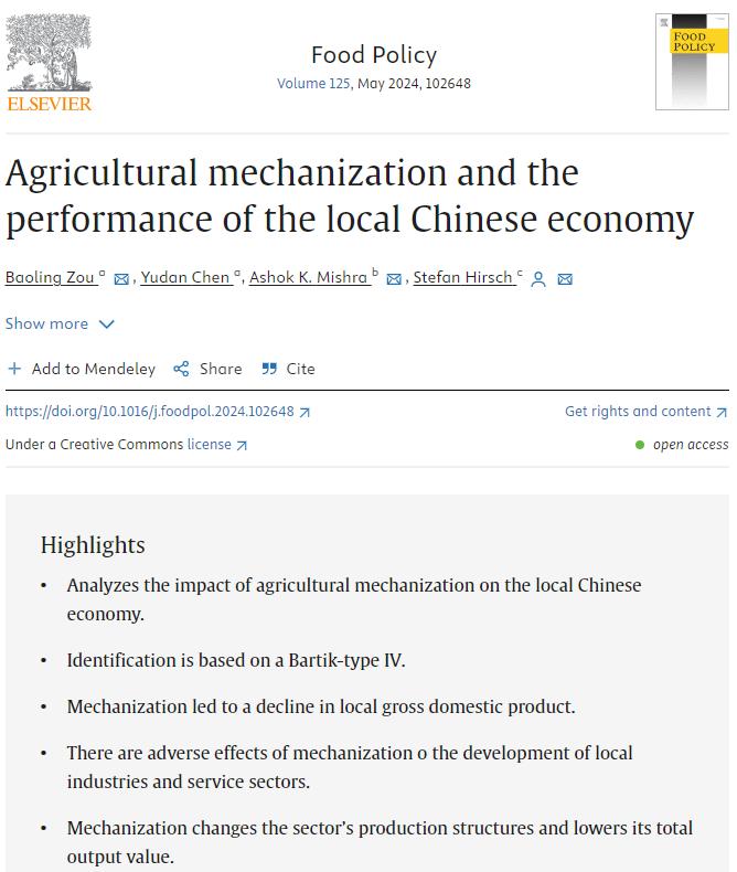 Baoling Zou, Yudan Chen, Ashok K. Mishra, Stefan Hirsch. (2024). Agricultural mechanization and the performance of the local Chinese economy. Food Policy, 125, 102648. https://doi.org/10.1016/j.foodpol.2024.102648