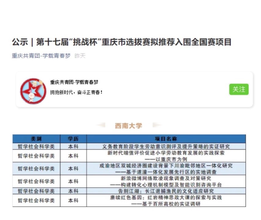 5月20日,第十七届“挑战杯”全国老员工课外学术科技作品竞赛重庆市选拔赛决赛在重庆大学举行,公司学子在本次赛事中表现优异,公司作品《成渝地区双城经济圈建设背景下川渝毗邻地区一体化研究——基于遂潼一体化发展先行区的实地调查》获得重庆市特等奖,成功入围全国赛,将于今年下半年参加由四川大学承办的第十七届“挑战杯”全国老员工课外学术科技作品竞赛全国决赛。