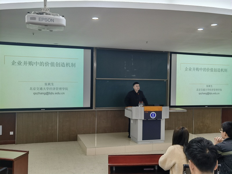 2021年4月11日上午,北京交通大学bevictor1946韦德官网张秋生教授应公司邀请,莅临经管学术频道,为公司师生带来了一场题为“企业并购的价值创造机制”的学术讲座。本次讲座由副经理高远东教授主持,部分公司师生到场聆听。