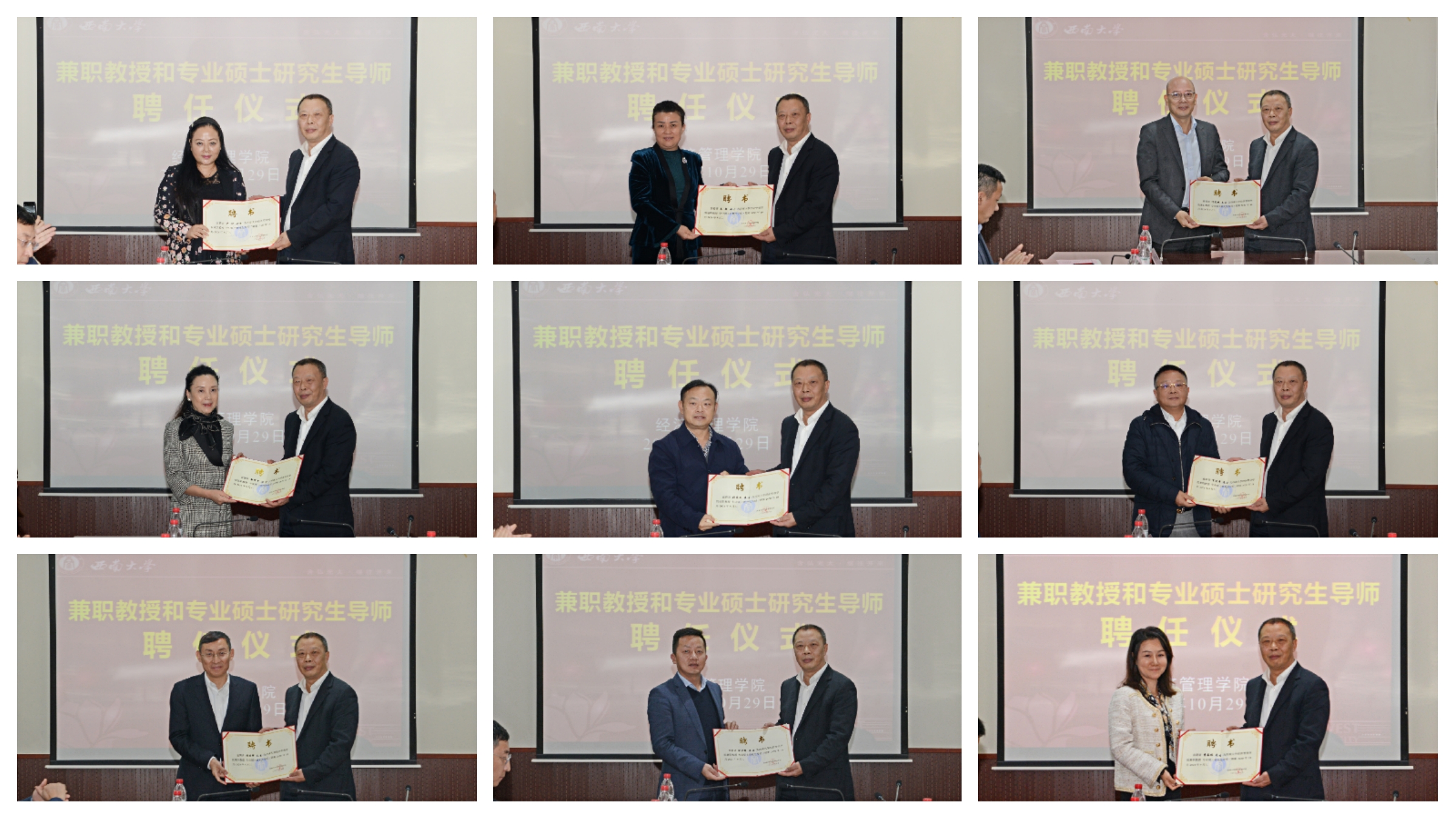 聘任仪式上,经理祝志勇分别为严琦(市工商联副主席,重庆陶然居集团董事长)、宋晓平(市工商联副主席,重庆兴亚控股集团有限公司董事长)、彭学平(市总商会副会长,学平大健康产业集团有限公司董事长)、张龙义(市总商会副会长,重庆潜能实业(集团)有限公司董事长)、曹春林(重庆市德源集团董事长)、叶定坎(市总商会副会长,重庆千叶眼镜连锁有限公司董事长)、王敏(市工商联副主席,万州区工商联主席,重庆林海实业集团有限公司董事长)、张国祥(市总商会副会长,重庆市富民银行股份有限公司董事长)、沈正华(九龙坡区工商联副主席,重庆辉腾能源有限公司董事长)9位企业家颁发了兼职教授和专业硕士研究生导师聘书。