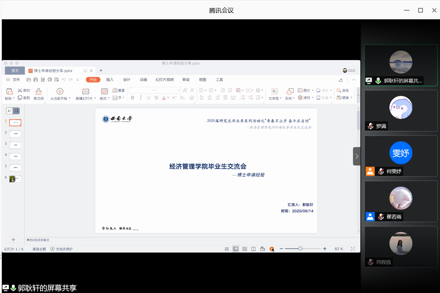 为充分发挥公司优秀毕业生的典型示范作用,为公司研究生搭建学习、交流、共同成长的平台,6月14日10:00,公司线上举办了2020届研究生毕业季系列活动之优秀毕业生交流会。交流会邀请了苏聪文、郭耿轩、邱圣頔、周密、雷媛媛5位毕业研究生分享申博经验和求职心得,公司党委副书记田丽、研究生辅导员柳为易以及各年级研究生参加活动,活动由公司研究生翟若雨主持。
