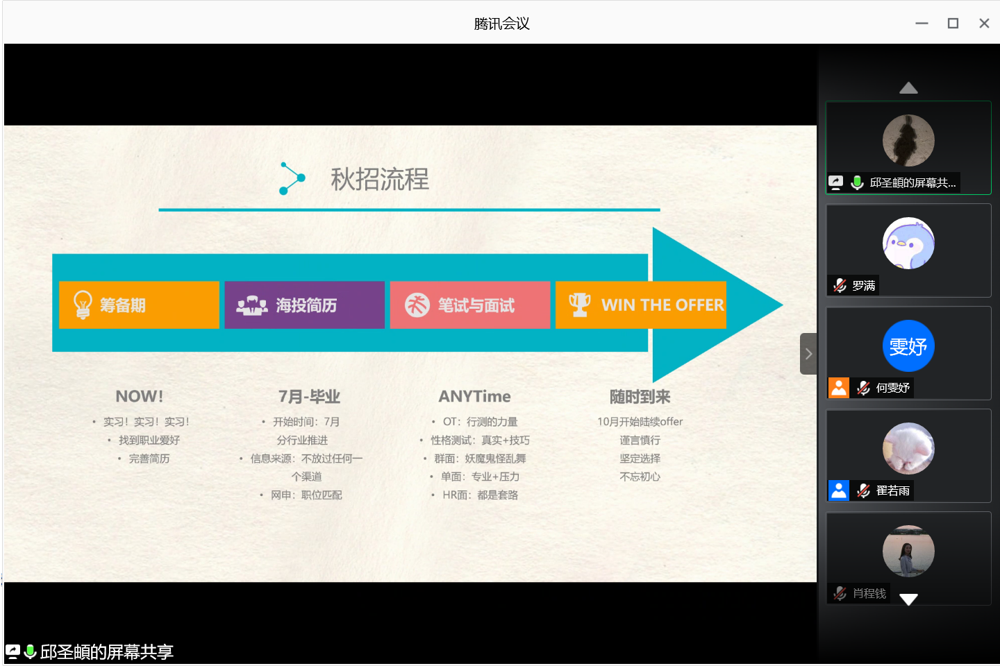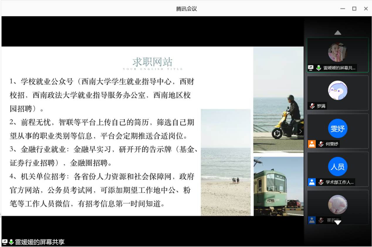 2017级研究生周密从求职方向的选择、求职材料的准备、求职过程的开始和求职结果的获得四个方面分享经验,他着重介绍校招过程中面试方式的变化,提出应对不同面试的建议,强调在求职过程中必须注重细节。