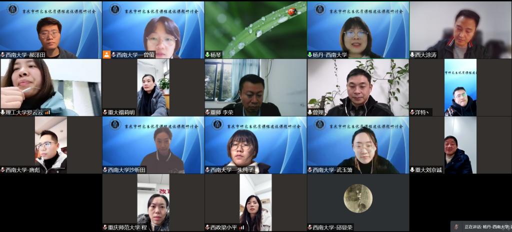 为贯彻《中国教育现代化2035》文件精神,发挥课程学习在公司产品中的作用,公司杨丹教授主持的重庆市教育委员会研究生教育教学改革研究重大项目“重庆市研究生优质课程建设实施成效分析及优化路径研究”(立项编号:yjg211023)自2021年6月立项以来,充分收集相关资料,研究重庆市研究生优质课程建设规律,对各高校市级研究生优质课程的管理制度、运行情况和建设成效等展开调查,以期对十四五期间重庆市研究生优质课程建设提供实施方案。本次会议的主要目的是交流重庆市研究生优质课程建设成效,研讨调查问卷和研究内容等。