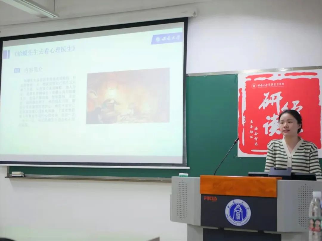 张梦迪同学分享的书籍是《蛤蟆先生去看心理医生》,她首先对书籍内容进行了简单介绍,提出四点推荐理由,如该书可爱、治愈、可操作性很强,可以用于简单的心理自助,也能够帮助大家解决一些原生家庭的困扰,用最简单的语言描述了最深刻、最容易被忽略的道理等。然后,她又分享了书籍中的部分内容,有人生的三种自我状态、人生坐标和心理游戏。最后,张梦迪同学提出最好的状态也许并不是稳定地处于“成人自我状态”,而是能灵活地实现“三位一体”,准确地把控自我状态的结论。