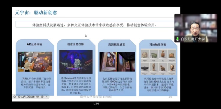 白长虹针对“元宇宙旅游是否会损失旅游原本的本真性”、“元宇宙如何高度赋能文旅深度融合”、“在进行实践研究时,如何与企业家进行深度沟通交流”和“在实践中,提升企业竞争力的根本管理方法”等问题,与师生进行了交流。