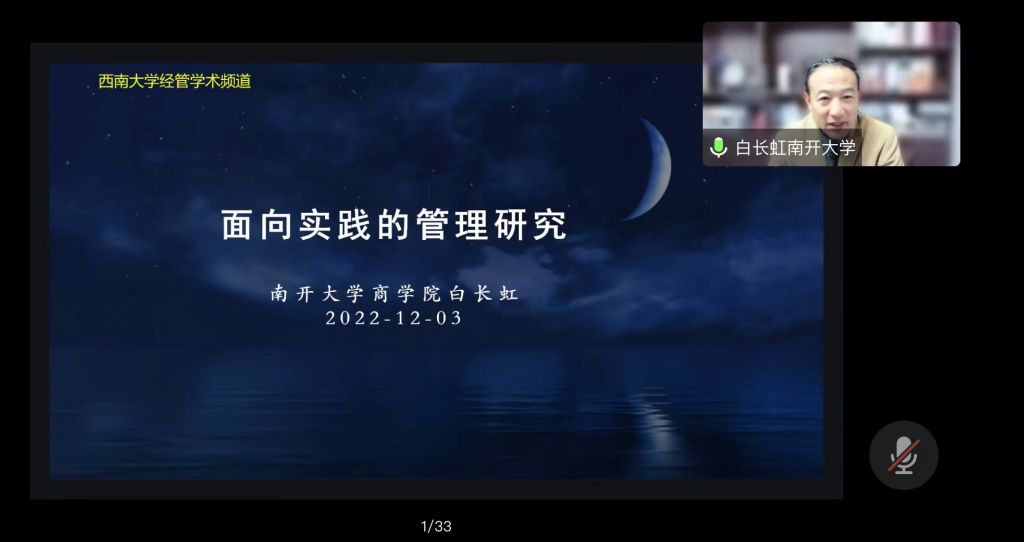 2022年12月3日,南开大学商公司经理白长虹教授应公司邀请线上为公司师生作了题为“面向实践的管理研究”的学术讲座,讲座由公司经理祝志勇教授主持。