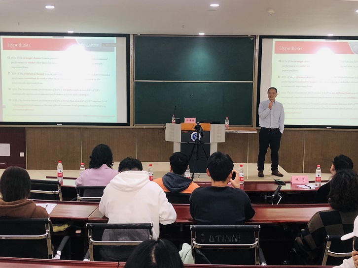 在祝志勇热烈欢迎与衷心感谢许年行教授接受邀请之后,许年行从地方官员环保任职经历出发,探究了有环保任职经历的官员对当地环境绩效会产生何种影响,并以中国上市公司为研究样本,结合“环境调查报告数据库”、“中国城市年鉴”和“国泰安数据库”等数据库的相关数据,证明有环保任职经历的官员所在城市企业有更低的二氧化硫排放量,并通过进一步分析得出这种影响在“官员处于第二个任期,以及企业对当地经济发展极具重要性”时会减弱。