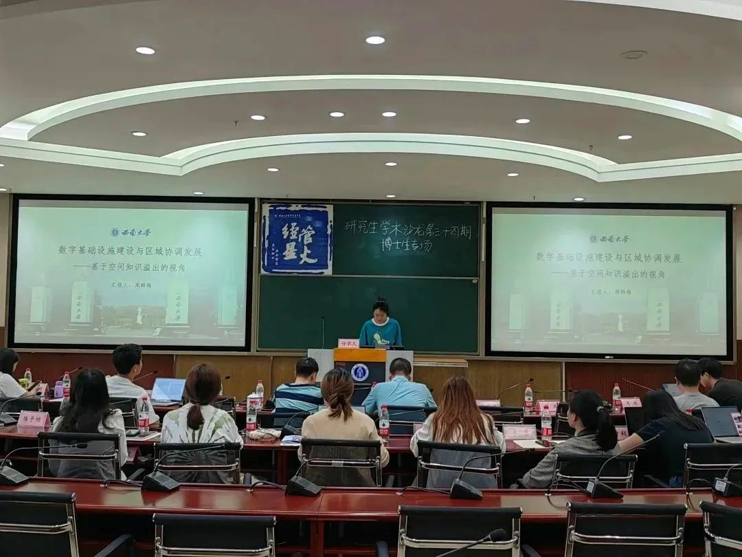 2023年4月21日下午,bevictor1946韦德官网第三十四期“经管·星火”研究生学术沙龙——博士生专场在公司B203教室举行。本次沙龙由2021级农业经济管理专业博士研究生邓明艳、2022级区域经济学专业博士研究生周韩梅担任主讲人,公司尹朝静、黄磊老师担任点评嘉宾。本次活动由2022级博士研究生孙帆主持。