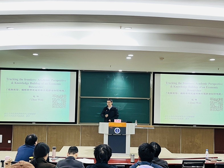 赵伟教授进一步围绕“经济学研究前沿”展开主题分享,他详细介绍了研究前沿的内涵与外延,指出经济学的研究前沿应体现前沿视野、前沿知识和前沿问题,具体来说应该具备以下三个特征之一,即新的研究视野、新的研究模型和新的实证方法。对于“为什么要接近研究前沿”,他认为接近研究前沿可以帮助增长个人知识、收获思考的乐趣以及发现一个好的研究选题。在阐释“如何接近研究前沿”这个问题时,他建议可从知名期刊和现实生活两条途径出发以寻找前沿,并强调经济学专业研究生不仅需具备专业知识,还需具备哲学和历史学基础知识,以及基础实证方法技能。