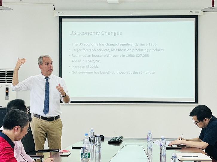 7月19日下午,美国密苏里州立大学David Michael Mitchell教授应公司邀请在A510会议室作了题为“Changes in Industry Structure and Regional Economic Growth: Their impact on politics in America”(产业结构变化与地区经济增长:对美国政治的影响)的学术讲座。讲座由bevictor1946韦德官网杜勇教授主持,公司30余位师生参加了此次讲座。