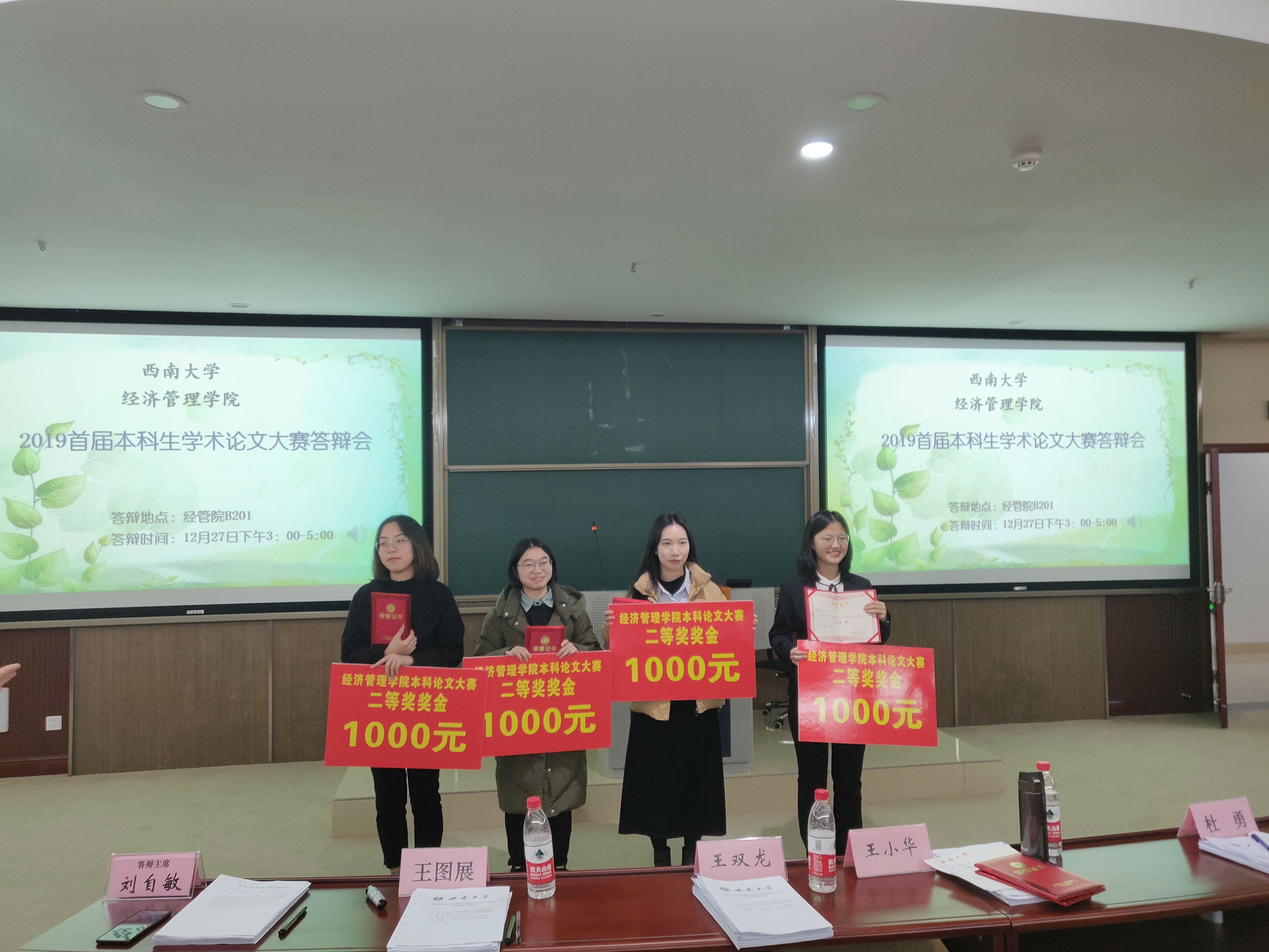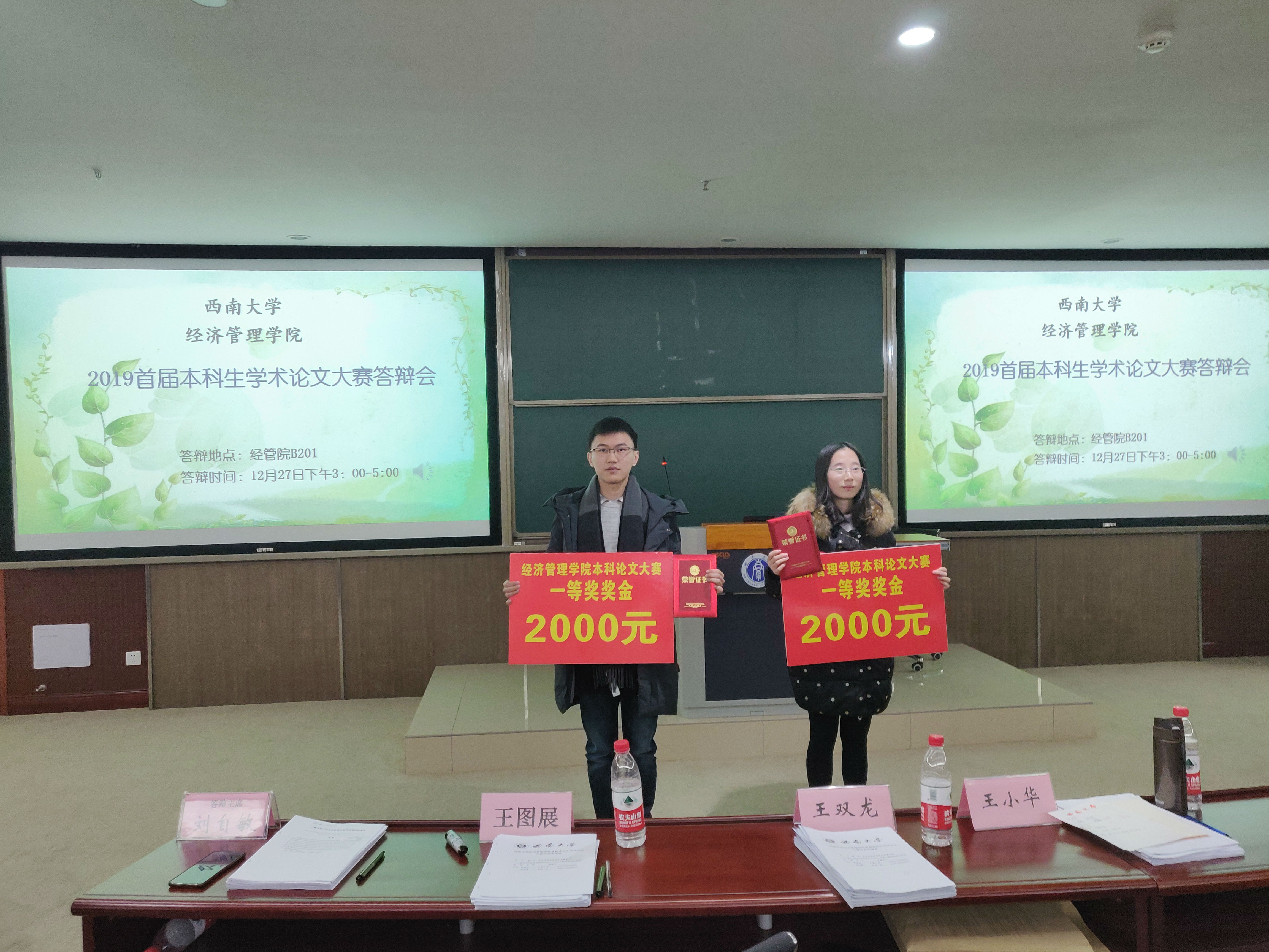 12月27日,在公司副经理高远东教授组织、经理助理杜勇教授协助下,由刘自敏、杜勇、王图展、王双龙、王小华等老师组成论文答辩专家组。专家们根据现场答辩,分别从论文中调查数据的可信性、指标的因果关系、变量的可控性、理论层面对调查结果的分析、研究结论与政策建议的关联性等方面对论文进行了点评,并有针对性地提出了修改意见。通过此次答辩,分别按照经济学方向、管理学方向评选出一等奖2名,二等奖4名,三等奖6名,为鼓励同学们的积极参与和科研创新动力,分别给予获奖同学2000元、1000元、200元的现金奖励;并择优录入《bevictor1946韦德官网本科生优秀学术论文集》及协助员工进行投稿。