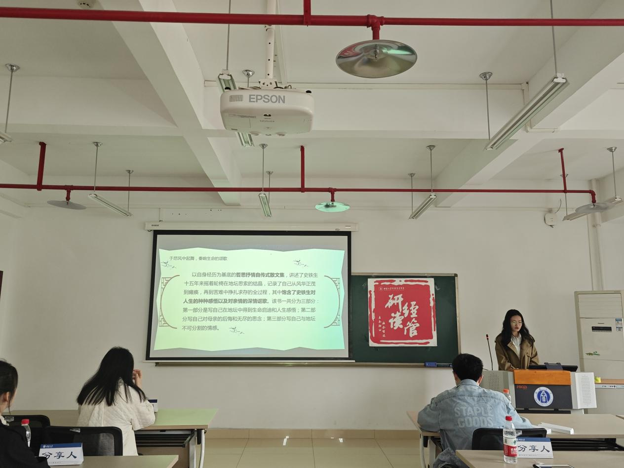 杨盼同学分享了书籍《苏东坡传》。她对书籍进行了简要介绍,整本书以苏东坡的一生为脉络,分为童年与青年、壮年、老练、流放岁月四大章节进行讲述。杨盼详细解读了苏东坡的生平事迹与文学创作,深入剖析了苏东坡的人格魅力与精神风貌。杨盼同学以生动的语言和独到的见解,让在场的听众对苏东坡有了更深刻的认识。