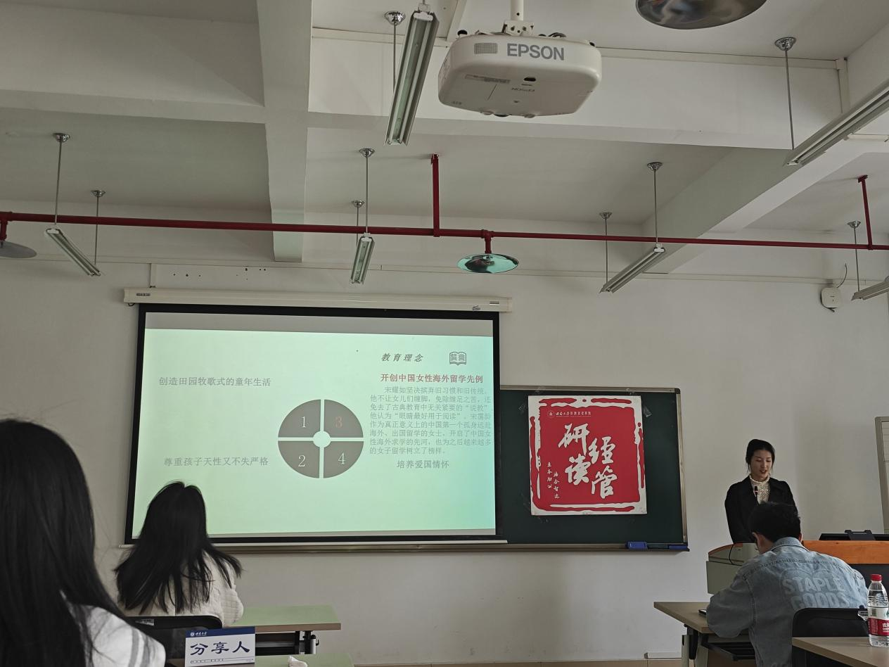 周梦同学推荐了书籍《宋氏三姐妹》,她讲述了宋霭龄、宋庆龄、宋美龄三姐妹的人生经历,详细讲解了三姐妹之父宋耀如的教育理念。最后,周梦同学分享了自己的读书感悟,她认为,学会尊重是一切教育的基础。