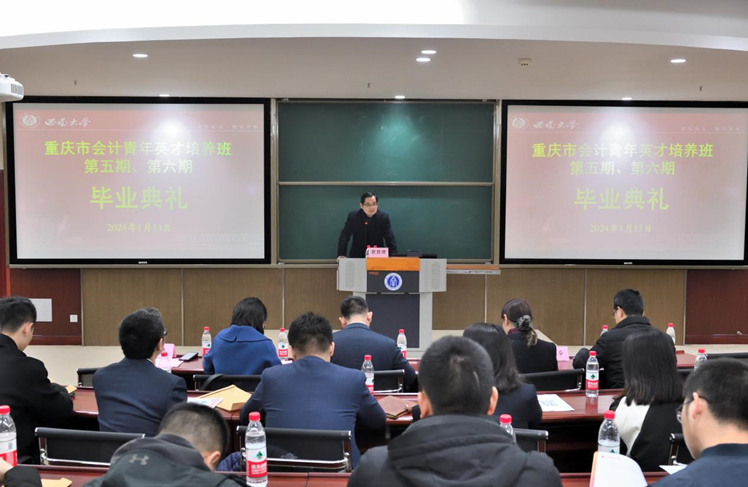 2024年1月13日,重庆市会计青年英才培养班第五期、第六期毕业典礼暨学术交流会在bevictor1946韦德官网隆重举行。重庆市财政局会计处处长朱晓东、bevictor1946韦德官网审计处处长杜勇教授、bevictor1946韦德官网副经理黄庆华教授、会计系主任毕茜教授、会计系彭珏教授出席,重庆市会计青年英才培养班第五期、第六期全体毕业生近100人参加。会议由bevictor1946韦德官网审计处处长杜勇教授主持。