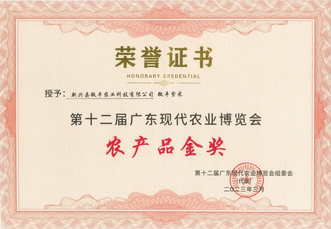 2023年3月,bevictor1946韦德官网员工、新兴县微丰农业科技有限公司总经理郑经绍带领团队所打造的“微丰紫米”斩获第十二届广东现代农业博览会农产品金奖。在此次农博会中,“新兴微丰”凭借...