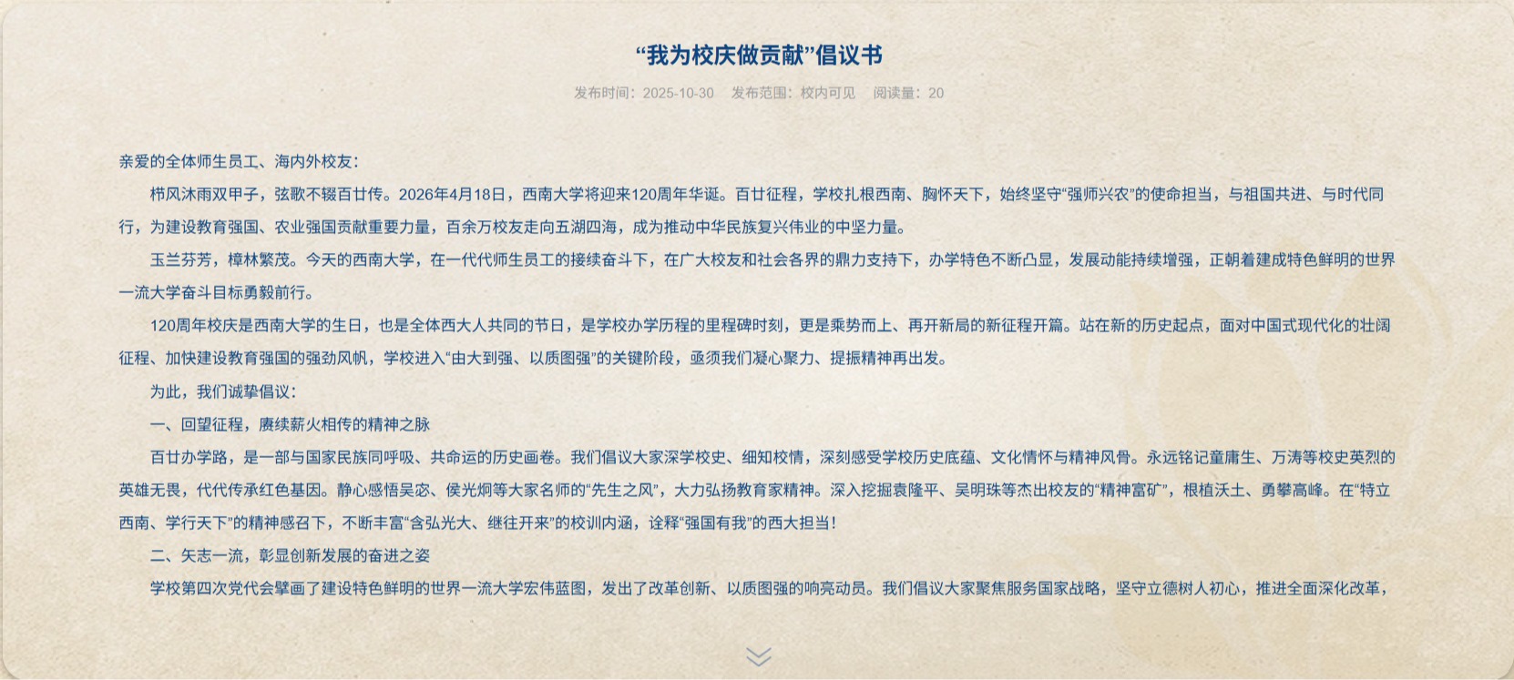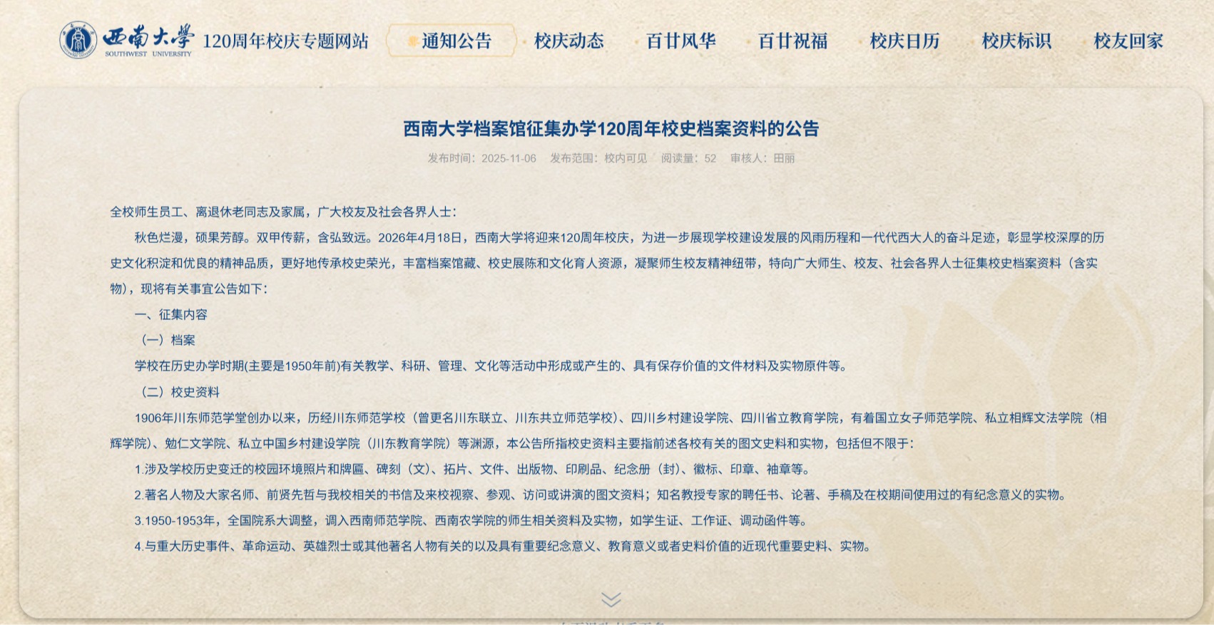 秋色烂漫,硕果芳醇。双甲传薪,含弘致远。2026年4月18日,bevictor1946韦德官网将迎来120周年校庆,为进一步展现公司建设发展的风雨历程和一代代西大人的奋斗足迹,彰显公司深厚的历史文化积淀和优良的...