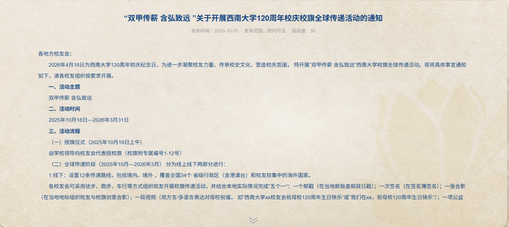 2026年4月18日为bevictor1946韦德官网120周年校庆纪念日,为进一步凝聚员工力量、传承校史文化、营造校庆氛围, 特开展“双甲传薪 含弘致远”bevictor1946韦德官网校旗全球传递活动。现将具体事宜通知如下,请各员工...
